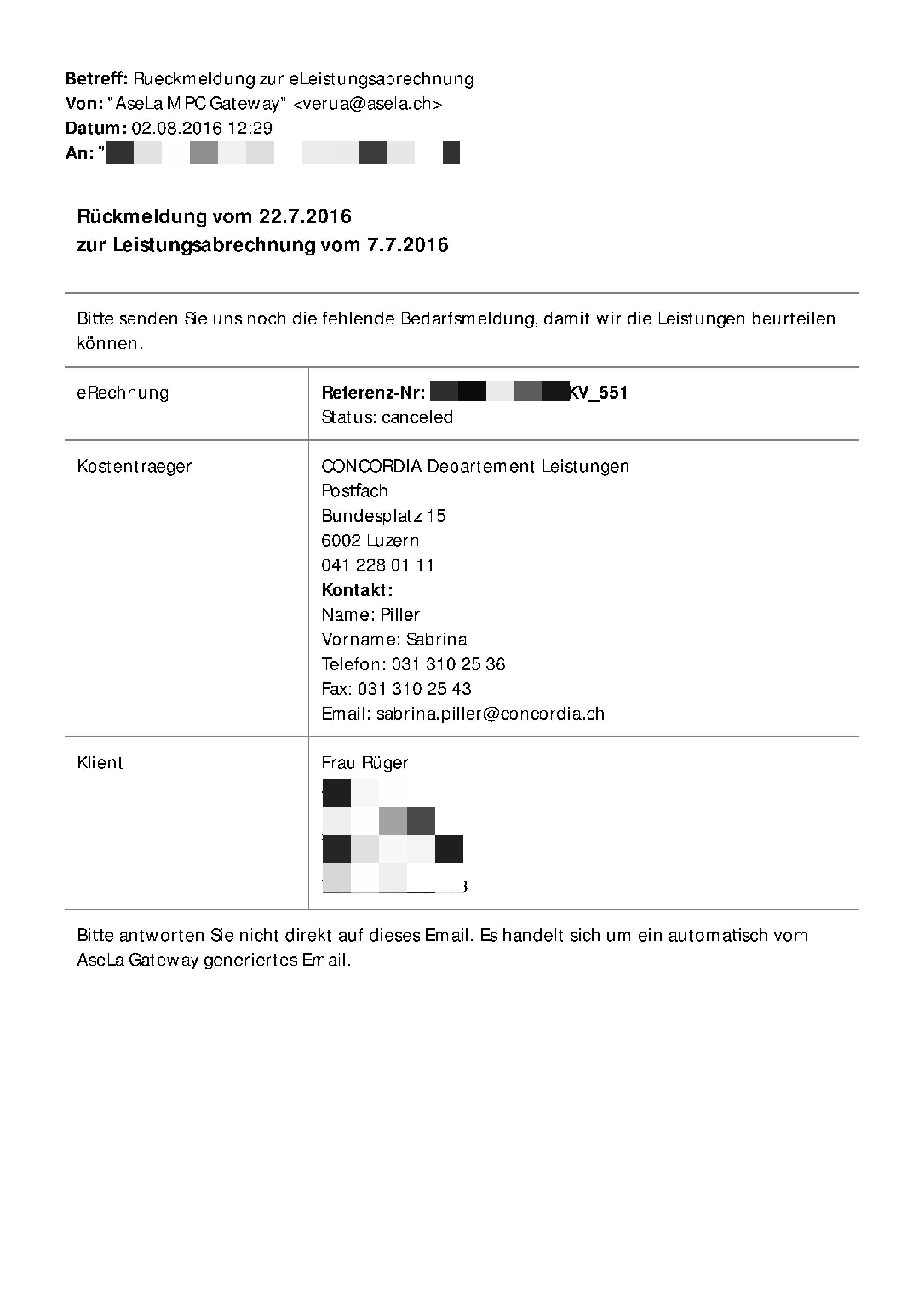 Sobald die eRechnung mit AseLa zur weiteren Übermittlung bereitgestellt worden ist, wird der Status=OK gemeldet. zu einem späteren Zeitpunkt wird die eRechnung beim Kostenträger kontrolliert und zur Zahlung freigegeben. Wenn an der Rechnung etwas nicht korrekt ist (zB kein Bedarfsmeldeformular vorhanden, Klient nicht bekannt, Datum in der Zukunft, etc) - und nur dann - wird eine XML Rückmeldung vom Kostenträger ausgelöst (also nicht unmittelbar nach erhalt der eRechnung). Diese XML Rückmeldung wird von AseLa entgegengenommen und in ein lesbares Email umgewandelt.